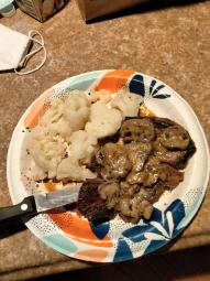 Post food you've made. Depicted is my attempt at a steak (flank steak, medium well as all steaks should be) with a mushroom sauce and cauliflower. Very simple, made it for myself and my grandmother and it was good.