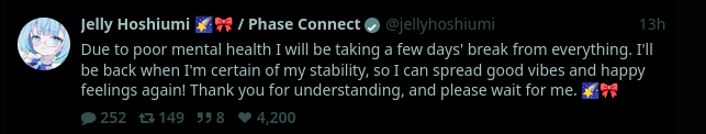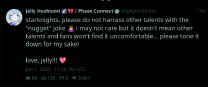 > What happened?> In the beginning, Jelly hoshiumi made a joke about showing her nubs at 100,000 subs or something. This was a jest at the old phase connect tradition to show feet at 100,000 subs> People began calling her a nugget (slang for a girl with no hands or legs).> An artist started drawing quadruple amputee images of Jelly hoshiumi> Jelly retweeted it because it was funny.> More people began drawing nugget art of her, eventually this spread outside of her community and people started drawing nugget art of other phase connect talents.> Other phase connect talents begin to seethe at the nugget fanart.> Phase connect members start issuing bans> Tenma bans someone for posting nugget art.> Lumi bans someone from chat for doing something nugget related> Jelly forced to tell her fanbase to cool it with the nugget art, and to stop posting nugget art of other vtubers.More info: