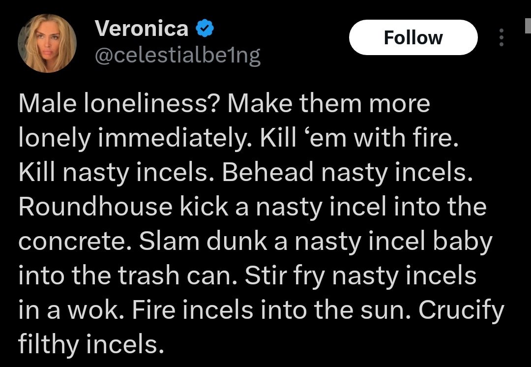 I hope this is a troll because if it isn't you need mental help, you say things like this and post gore and act like it's some epic win against women as a cohort and then wonder why you have no friends. It's creepy.
