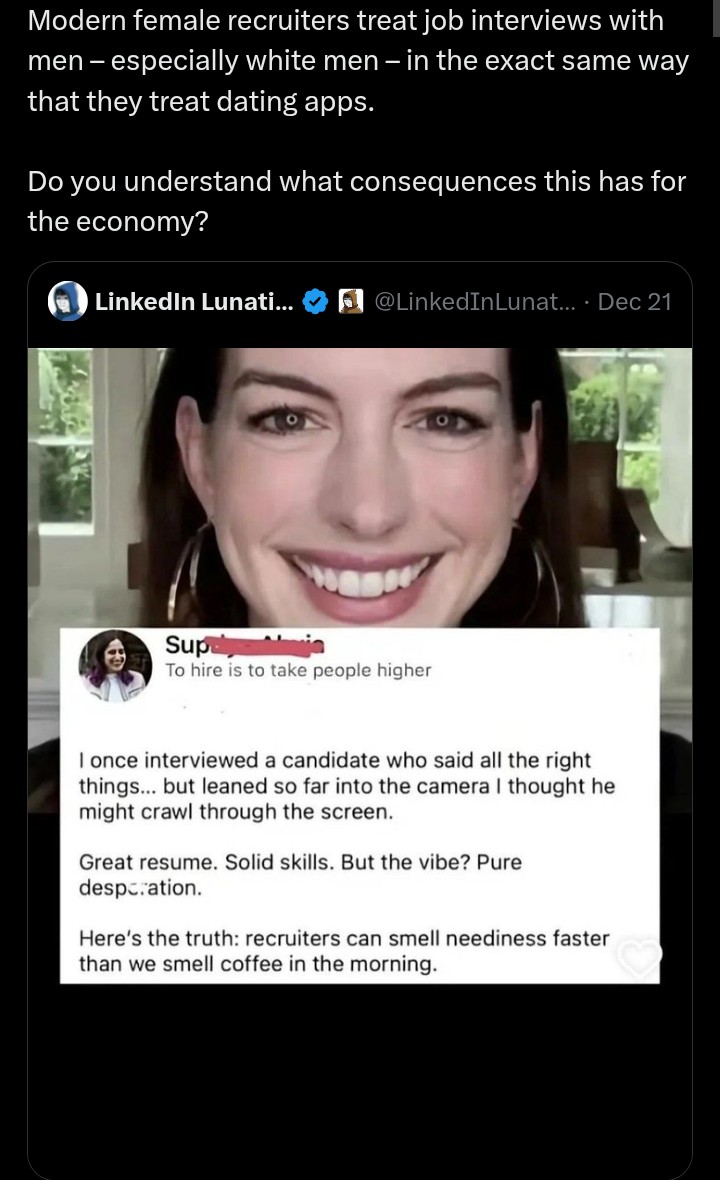 >>245507>can smell needinesswtf is the problem with that? i think she meant desperation. yes, bitch, in this economy, people are desperate for a fucking job. everyone is poor. everyone is struggling. incels are actually kind of right on this one, that's the most retarded hiring criteria ive ever heard