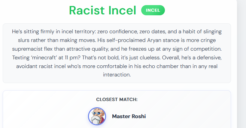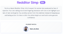 >>192432He comes off as a painfully polite, naive nice guy who overanalyzes dry replies and avoids any risk of rejection. With zero dating experience and ghostings shrugged off as “her loss,” he’s a textbook simp too shy to make bold moves. His canned “my dih hurts” quip sums up his self-pitying, indecisive vibe. If dating were Reddit karma, he’d be downvoted to oblivion — a true Redditor Simp.