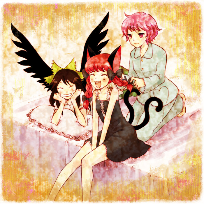 it can't be helped… these things will happen when you two play with each other. it's great that you're such good friends. besides, okuu already forgot about it, so it would be pointless to scold her. does it hurt? here, orin. i'm going to spoil you a bit to make up for it. there, there… feeling better now? come here, lets hug each other for a bit, my cute pets.