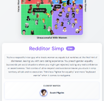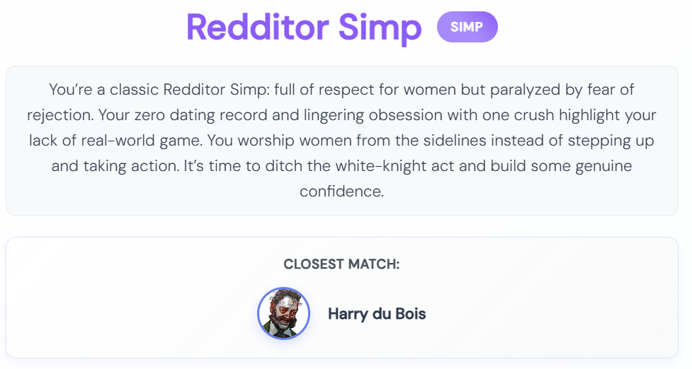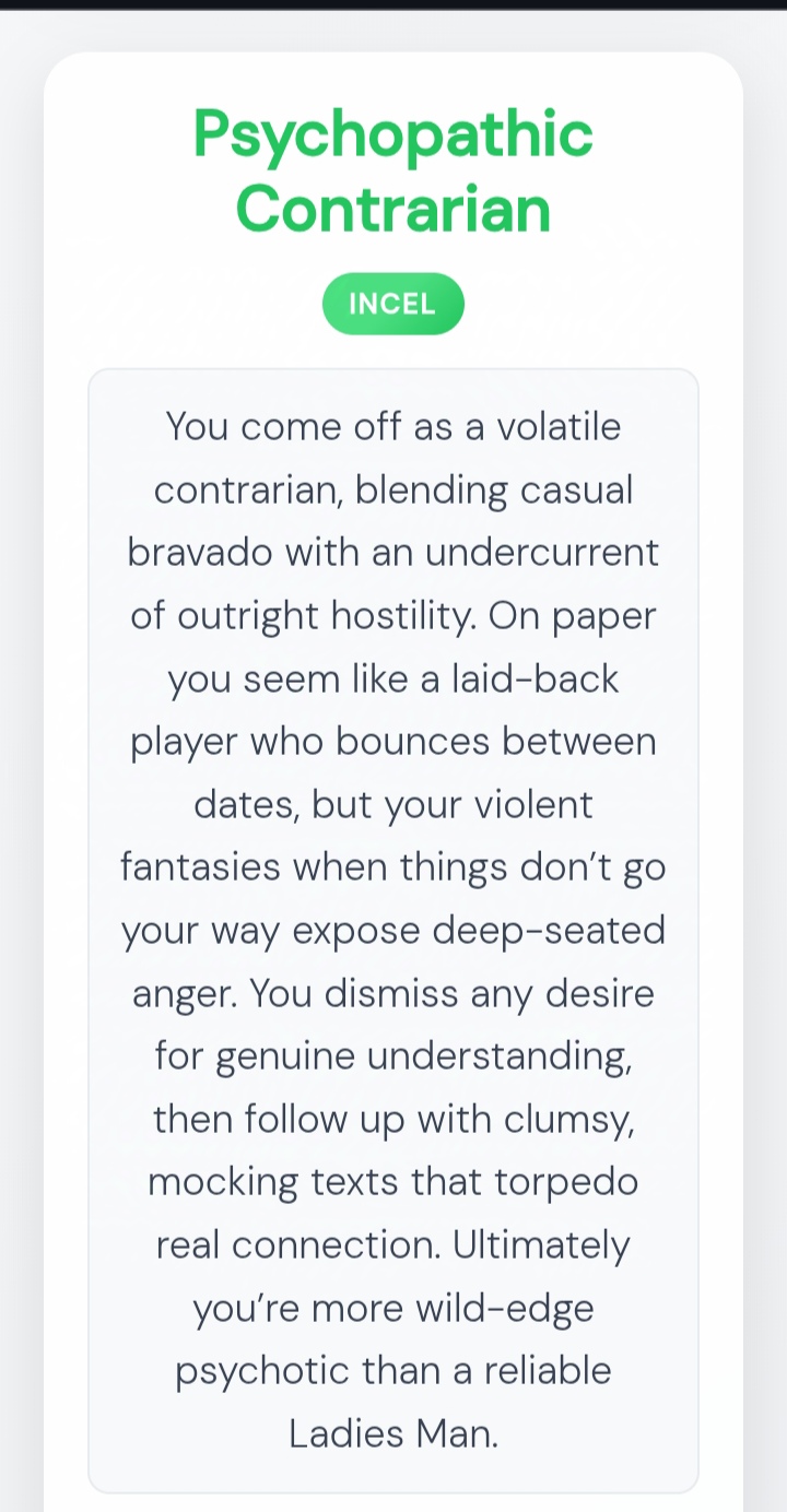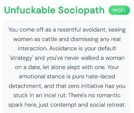 >>192432He comes off as a painfully polite, naive nice guy who overanalyzes dry replies and avoids any risk of rejection. With zero dating experience and ghostings shrugged off as “her loss,” he’s a textbook simp too shy to make bold moves. His canned “my dih hurts” quip sums up his self-pitying, indecisive vibe. If dating were Reddit karma, he’d be downvoted to oblivion — a true Redditor Simp.